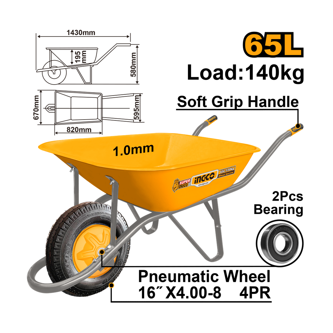 | Carga (kg): 140; Capacidade de Água (L): 65; Capacidade de Areia (CBF): 5; N.W: 15,2kg Roda: 16″X4,00-8, roda pneumática com rolamento 4PR, alça de empunhadura suave de três tons, L*H*C*A*B*h(mm): 1430*580*595*820*670*195 Bandeja com espessura de 1,0mm, cabo com 1,5x32mm |