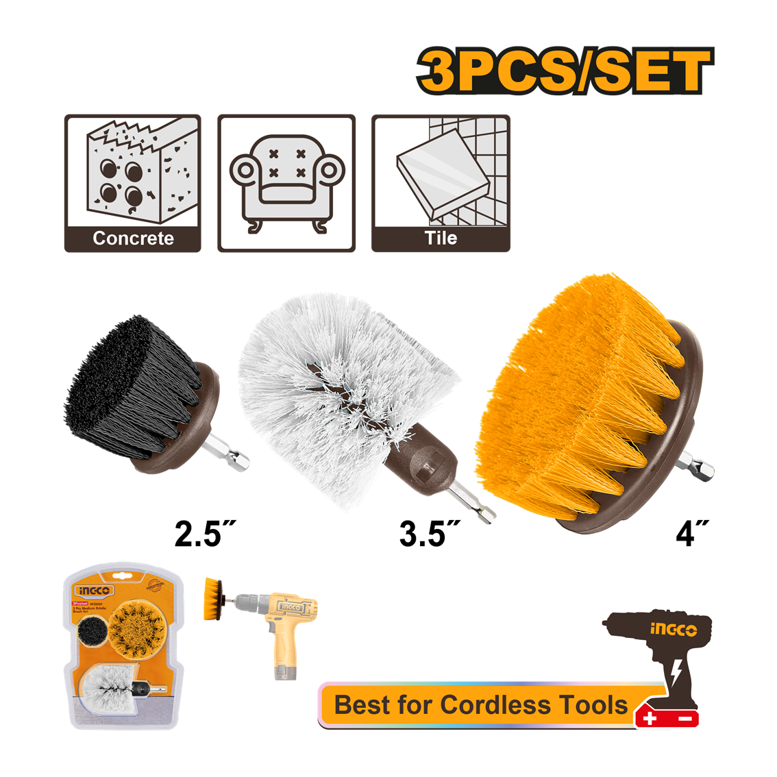 | Haste: 1/4″ Hexágono Inclui: 1 Peça Escova de cerdas duras de 2,5″ 1 Escova de cerdas macias de 3,5″ 360 graus 1 Escova de cerdas médias de 4″ Ideal para limpeza: banheiras, chuveiros, porcelana, granito, tampos de fogão, carpete, vinil, laminado e madeira, tijolo, concreto |
