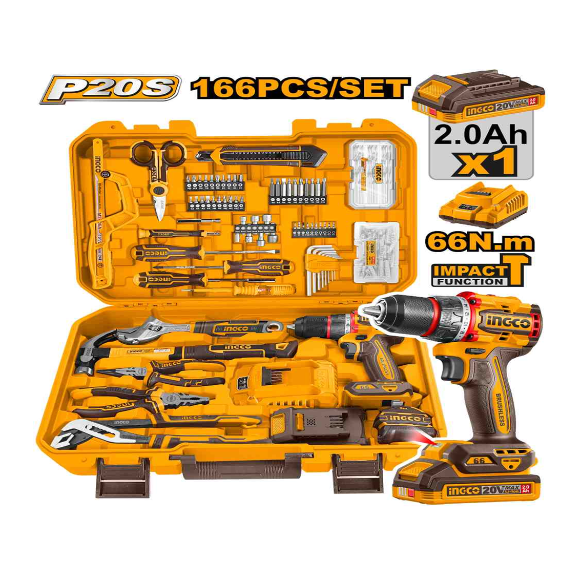 KIT 166 FERRAMENTAS C/PARAFUSADEIRA 66N.m C/1 BAT 2.0Ah INGCO HKTHP41662-9